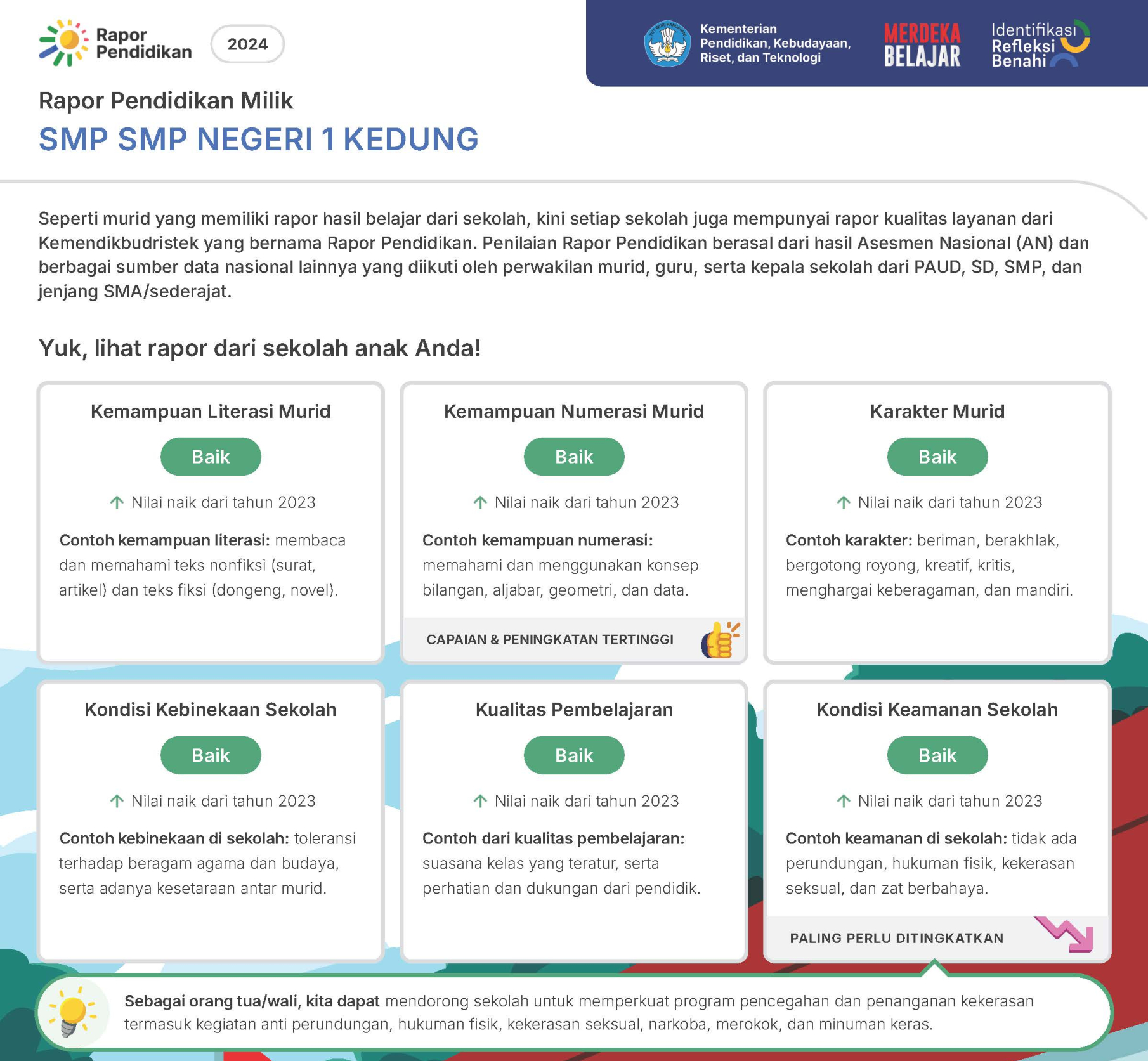 Hasil dari Rapor pendidikan ANBK SMP Negeri 1 Kedung https://raporpendidikan.kemdikbud.go.id/ menunjukkan predikat baik dan mengalami kenaikan dari tahun 2023 per poin, seperti data di atas, namun ada catatan dalam rapor pendidikan khusus untuk orang tua/ wali agar mendorong sekolah memperkuat program pencegahan kekerasan termasuk kegiatan anti perundungan, hukuman fisik, kekerasan seksual, narkoba, merokok, dan minuman keras. Walaupun di SMP Negeri 1 Kedung tidak ada pelanggaran hal tersebut. Hasil Rapor di atas bisa menjadi motivasi kedepan dalam pelaksanaan pembelajaran yang lebih baik minimal mempertahankan rapor pendidikan di atas.